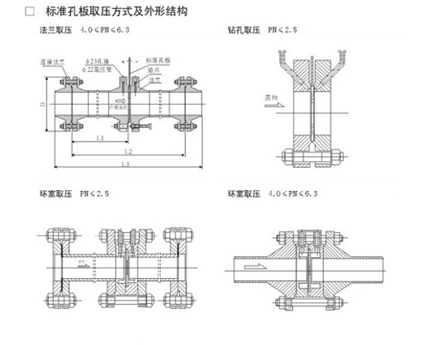 2.孔板的正負壓方向,上下游取壓法蘭應與介質流向相符,取壓孔的方位可根據(jù)介質不同和變送器的安裝情況確定。